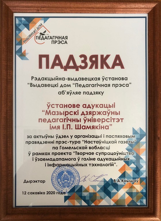 По окончании встречи от всей делегации участников пресс-тура, директор  Редакционно-издательского учреждения «Издательский дом «Педагогическая пресса» В.А. Кнышев вручил коллективу работников УО МГПУ имени И.П.Шамякина благодарность за активное участие в организации и успешном проведении пресс-тура «Настаўніцкай газеты» по Гомельской области в рамках проекта «Творческое сотрудничество и взаимопомощь в области образовательных и информационных технологий». По итогам встречи определены перспективы сотрудничества.