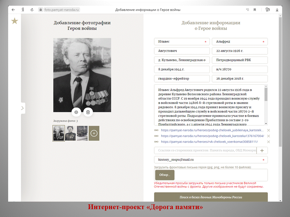 10 декабря 2020 г. студент 4 курса, 3 группы филологического факультета специальности «История и обществоведческие дисциплины» Цупа Арсений Сергеевич принял участие в интернет-проекте «Дорога памяти», организованного Министерством обороны Российской Федерации. Целью проекта является увековечение памяти погибших при защите Отечества. «Дорога памяти» – это общедоступная единая база данных о каждом участнике Великой Отечественной войны. Данный проект также будет реализован в виде крупнейшего памятника с именами и портретами героев Великой Отечественной войны на территории военно-патриотического парка культуры и отдыха «Патриот». Мемориал, увековечивающий миллионы имен участников войны, отчаянно сражавшихся за Родину, и дополненных их портретами, навсегда останется в сердцах их соотечественников и потомков.