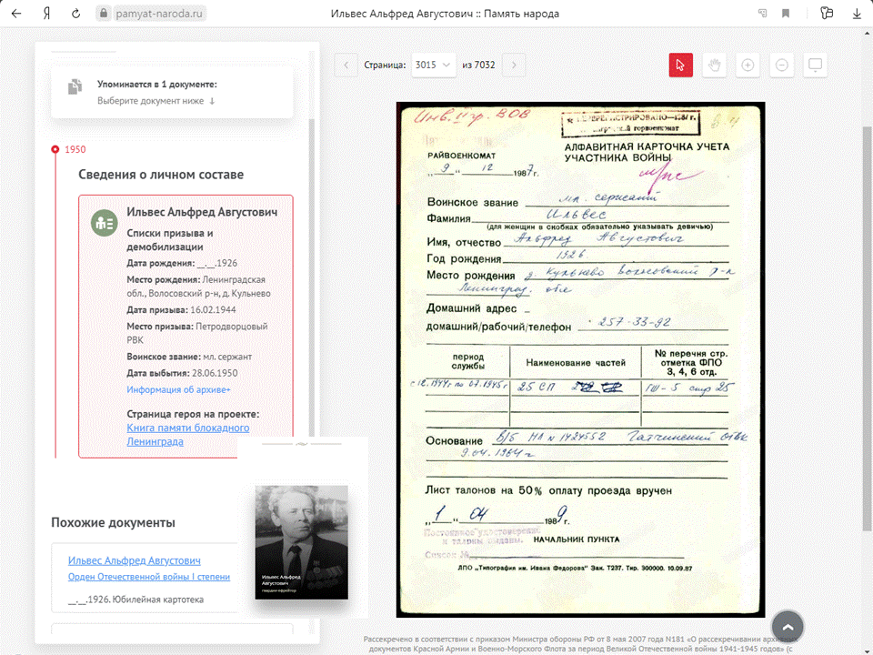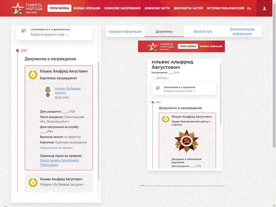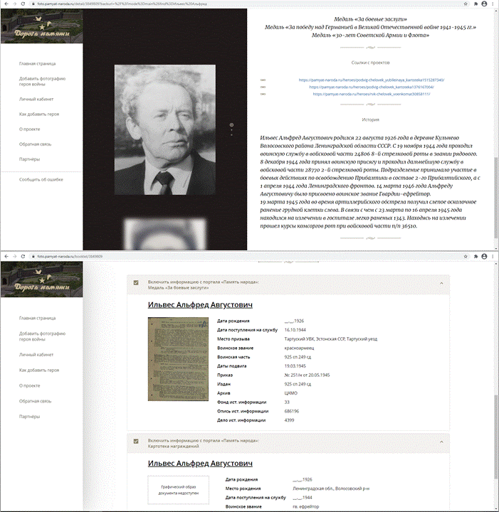 Цупа А.С. разместил с помощью данного проекта сведения о своем прадеде Ильвесе Альфреде Августовиче. Имя его прадеда Ильвеса А.А. навсегда будет запечатлено на мемориале «Дорога памяти», представляющем собой крупнейший военно-исторический памятник. Немаловажным фактом является то, что функция поиска и соотнесения материала об участнике войны проекта «Дорога памяти» позволила Цупе Арсению найти документальные материалы, в соответствии с которыми он узнал новую дополнительную информацию о своем прадеде, отсутствующую в семейном архиве.