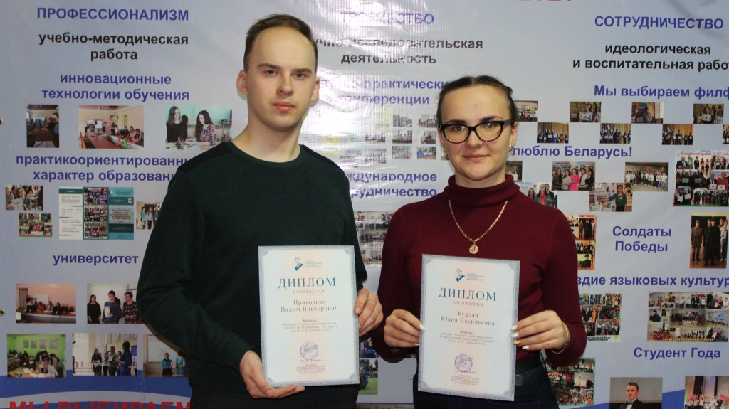 Учреждение образования «Мозырский государственный педагогический университет имени И.П. Шамякина» представили студенты 4 курса филологического факультета (специальность «История и обществоведческие дисциплины») Приходько Вадим Викторович и Кудлач Юлия Васильевна. Наши студенты стали финалистами этого престижного конкурса. Научная работа на тему: «Патриотическое воспитание студенческой молодежи (на примере реализации историко-биографических проектов «Солдаты Победы» и «Дети войны» (научный руководитель: Сыманович Т.Н., декан филологического факультета, кандидат педагогических наук) была отмечена жюри дипломом конкурса молодых международников Содружества Независимых Государств имени А.А. Громыко.