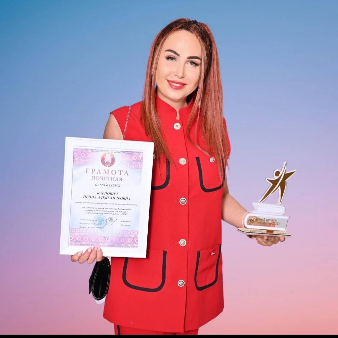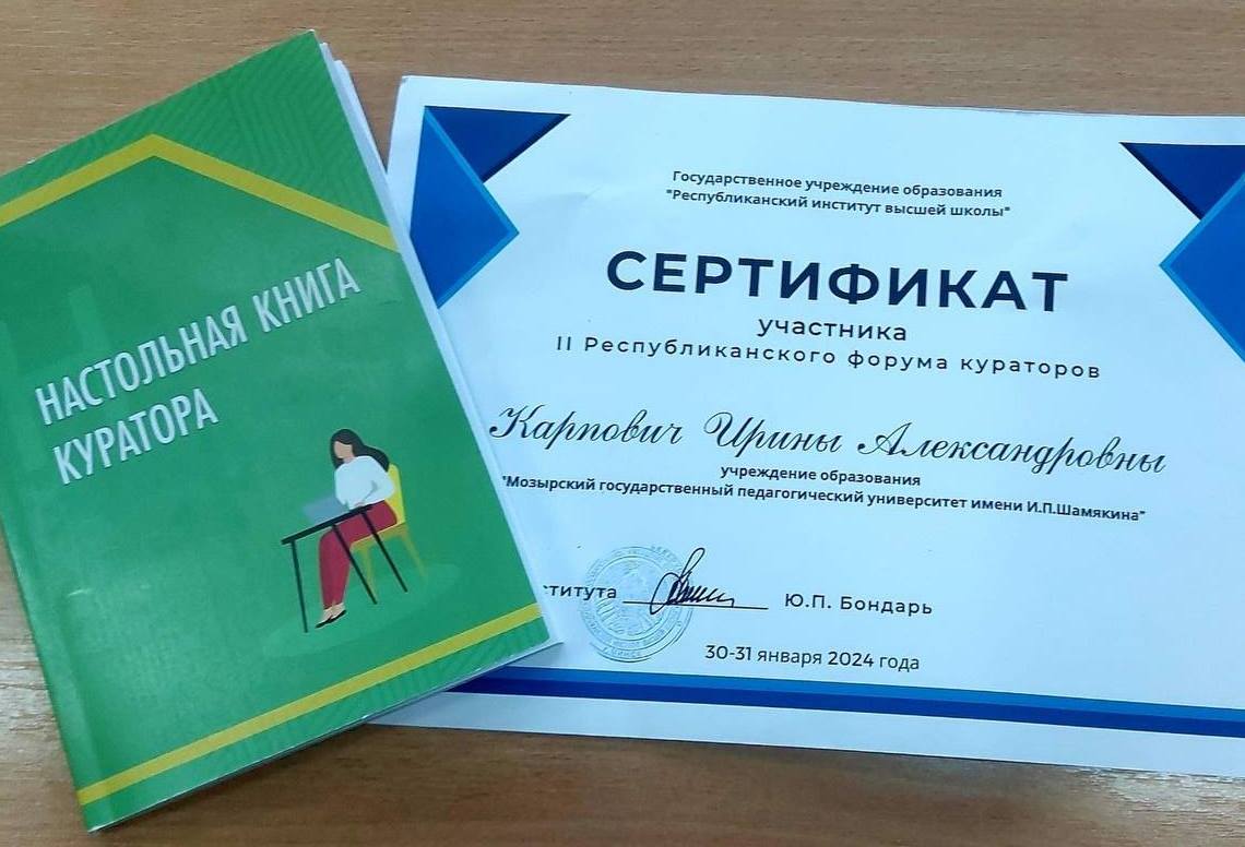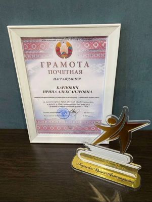 Для участия в республиканском конкурсе был обобщен методический опыт И.А. Карпович. Награждение победителей первого тура конкурса было проведено на втором республиканском «Форуме кураторов» в г. Минске (февраль 2024). По результатам конкурса Ирина Александровна была награждена памятным подарком и сертификатом.