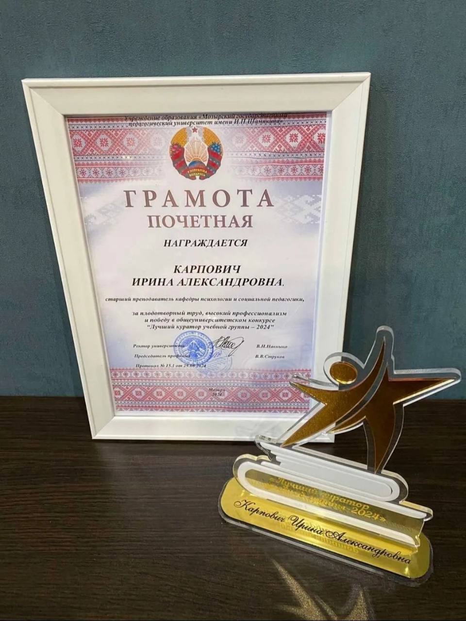Ирина Александровна награждена ректором университета В. Н. Навныко почетной грамотой и именным кубком победителя общеуниверситетского конкурса «Куратор года» 02.09.2024 года на линейке, посвященной Дню Знаний.