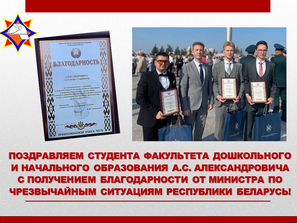 Поздравляем студента факультета дошкольного и начального образования А.С. Александровича с получением благодарности от министра по чрезвычайным ситуациям Республики Беларусь