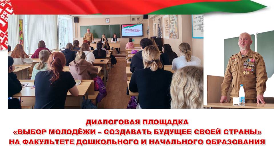 18 февраля в УО МГПУ им. И.П.Шамякина прошла диалоговая площадка «Выбор молодёжи – создавать будущее своей страны», в которой приняли участие студенты факультета дошкольного и начального образования. Студенты и гости мероприятия обсуждали влияние выбора каждого гражданина на будущее всей страны.
