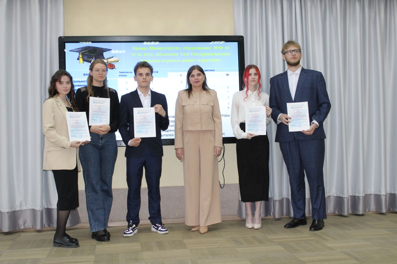 С высокой сцены пленарного заседания были озвучены результаты XXXI Республиканского конкурса научных работ студентов. Дипломы I категории в скором времени будут подписаны Министром образования Республики Беларусь и вручены в торжественной обстановке. Дипломантам II и III категорий были вручены сертификаты первым проректором университета Ириной Олеговной Ковалевич.