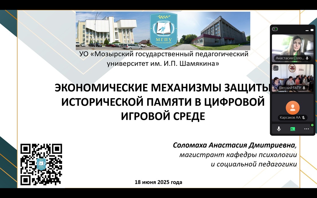 Наш университет представляла магистрантка Соломаха Анастасия Дмитриевна, которая выступила с докладом «Экономические механизмы защиты исторической памяти в цифровой игровой среде» в рамках секции «Социально-экономическое развитие отраслей и регионов в цифровой экономике».