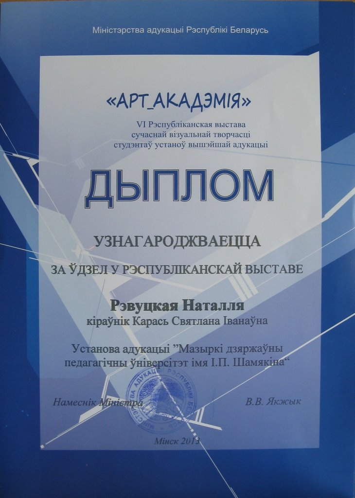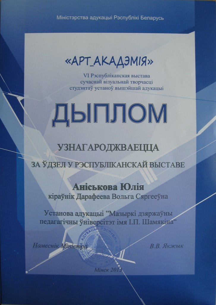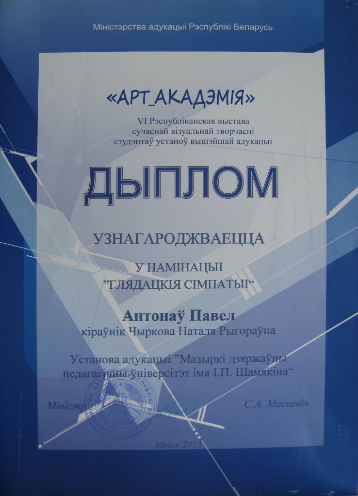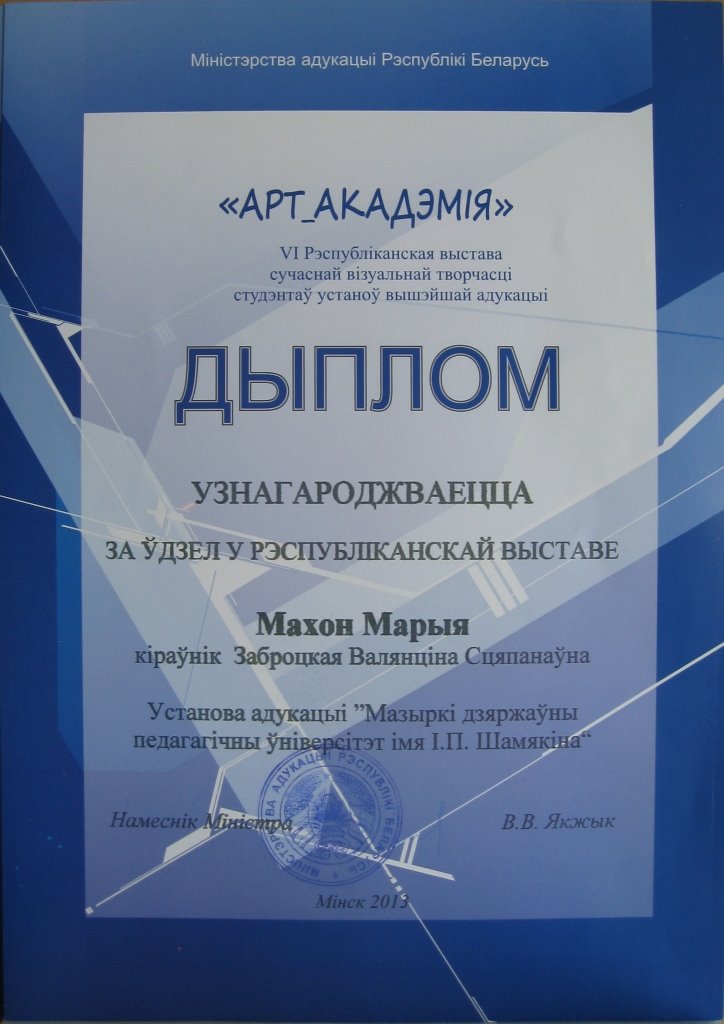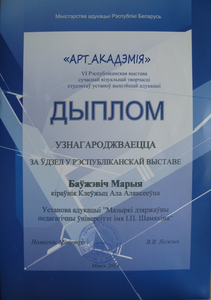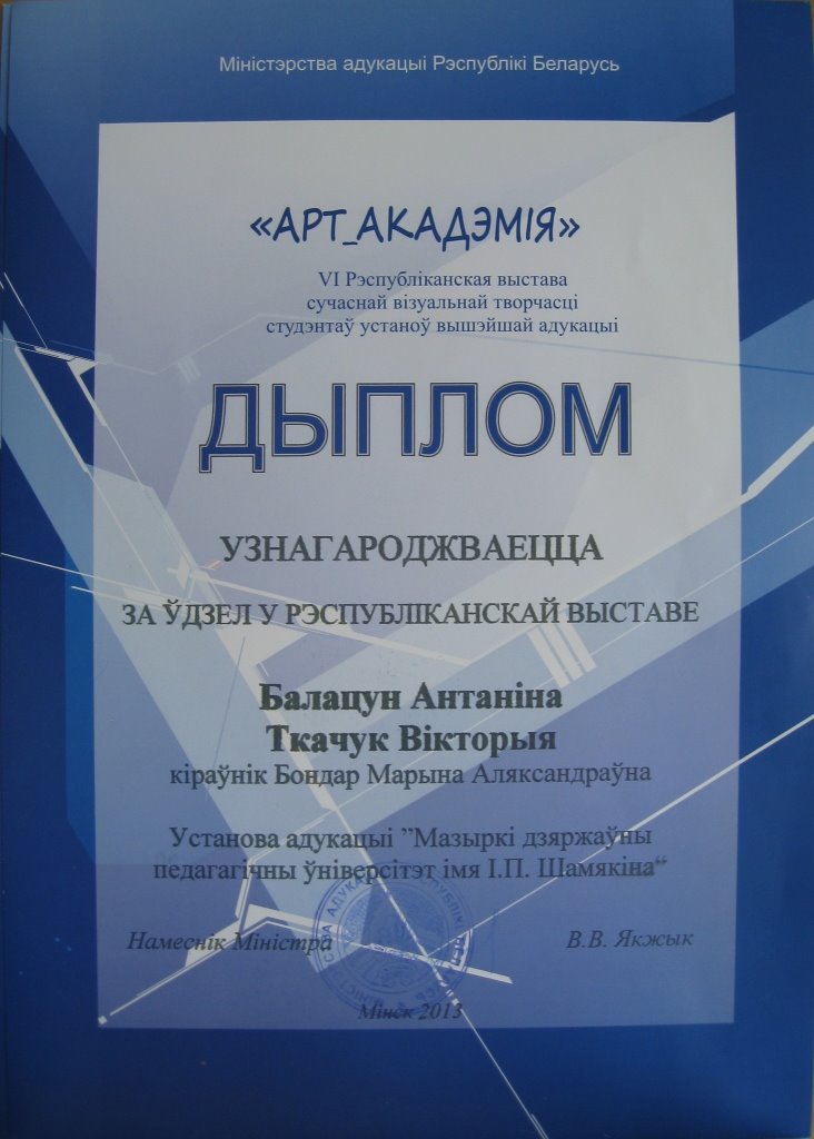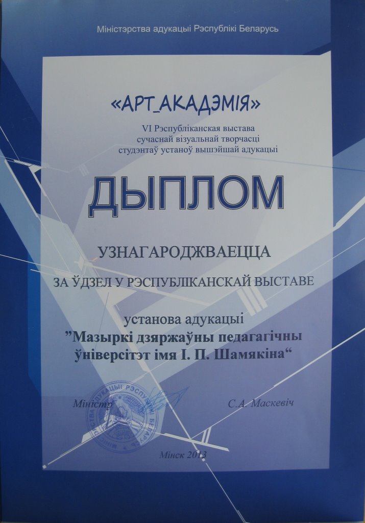 УО МГПУ им. И.П. Шамякина на республиканской выставке представляли работы, выполненные студентами факультета технологии под руководством преподавателей кафедры изобразительного искусства и графики. По итогам художественного конкурса экспозиция нашего университета награждена Дипломом Министерства образования Республики Беларусь. Работа Антонова Павла удостоена диплома в номинации «Зрительская симпатия», а работы студентов Болжевич Марии, Реутской Натальи, Балацун Антонины, Ткачук Виктории, Махон Марии, Аниськовой Юлии отмечены дипломами участника.