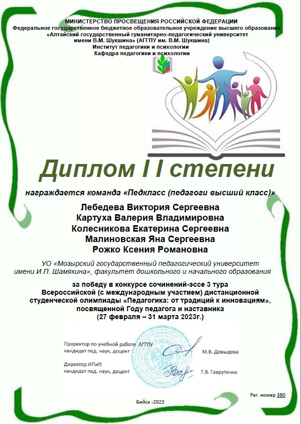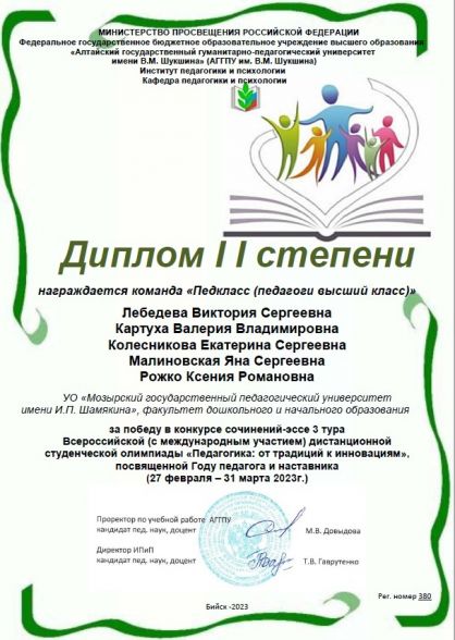 В период с 27 февраля по 31 марта 2023 года проходила Всероссийская (с международным участием) дистанционная студенческая олимпиада «Педагогика: от традиций к инновациям», организованная ФГБОУ ВО «Алтайский государственный гуманитарно-педагогический университет имени В.М. Шукшина» для студентов высших учебных заведений, магистрантов. Команда Мозырского государственного педагогического университета имени И.П. Шамякина, в которую вошли студенты 3-го и 4-го курсов специальности «Начальное образование» (Лебедева Виктория, Рожко Ксения, Картуха Валерия, Колесникова Екатерина) и магистрант специальности «Теория и методика обучения и воспитания» (Малиновская Яна) одержала победу в 3 туре – конкурсе сочинений-эссе. Результаты участия были оценены Диплом II степени. Задание тура выполнено под руководством доцента кафедры специальной педагогики и методик дошкольного и начального образования Асташовой Анжелы Николаевны. Вручение Диплома победителя проходило в торжественной обстановке пленарного заседания XХX Международной студенческой научно-практической конференции «От идеи – к инновации».