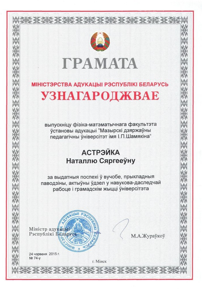 23 преподавателя и выпускника получили благодарности от Президента. Астрейко Наталья за выдающиеся успехи в учебе, образцовое поведение, активное участие в научно-исследовательской работе и общественной жизни учреждения образования была награждена Грамотой Министерства образования Республики Беларусь.