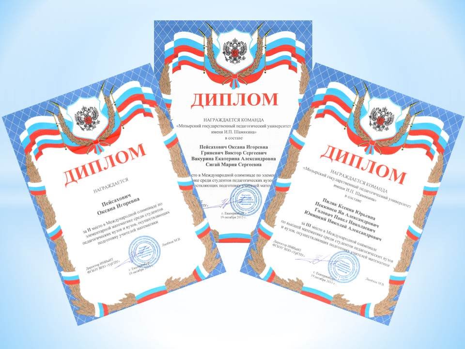 По итогам международных олимпиад по элементарной и высшей математике для студентов педвузов и вузов, осуществляющих подготовку будущих учителей математики студенты физико-математического факультета награждены тремя дипломами. Команда МГПУ им. И.П. Шамякина заняла первое место в олимпиаде по элементарной математике, второе место в личном первенстве, третье место в олимпиаде по высшей математике.