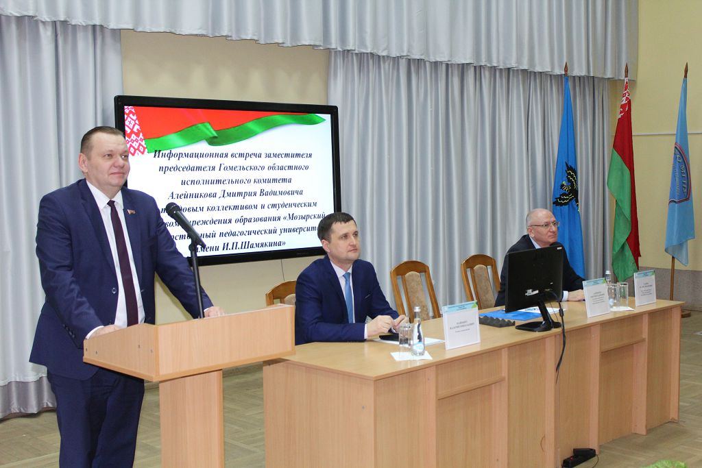 18.01.2023 года заместитель председателя Гомельского областного исполнительного комитета Дмитрий Вадимович Алейников с рабочим визитом посетил учреждение образования «Мозырский государственный педагогический университет им. И.П. Шамякина», где встретился с трудовым коллективом и студенческой молодежью университета. Дмитрий Вадимович был ознакомлен с музеем этнографической культуры Полесского края и истории университета, с работой идеологического центра, а также с выставками достижений университета. Выступая перед аудиторией, Алейников Д.В. подробно рассказал о задачах, которые стоят перед руководством на данном этапе развития страны, о необходимости заполнения педагогическими кадрами учреждений образования Гомельского региона, о подготовке высококвалифицированных морально устойчивых специалистах.