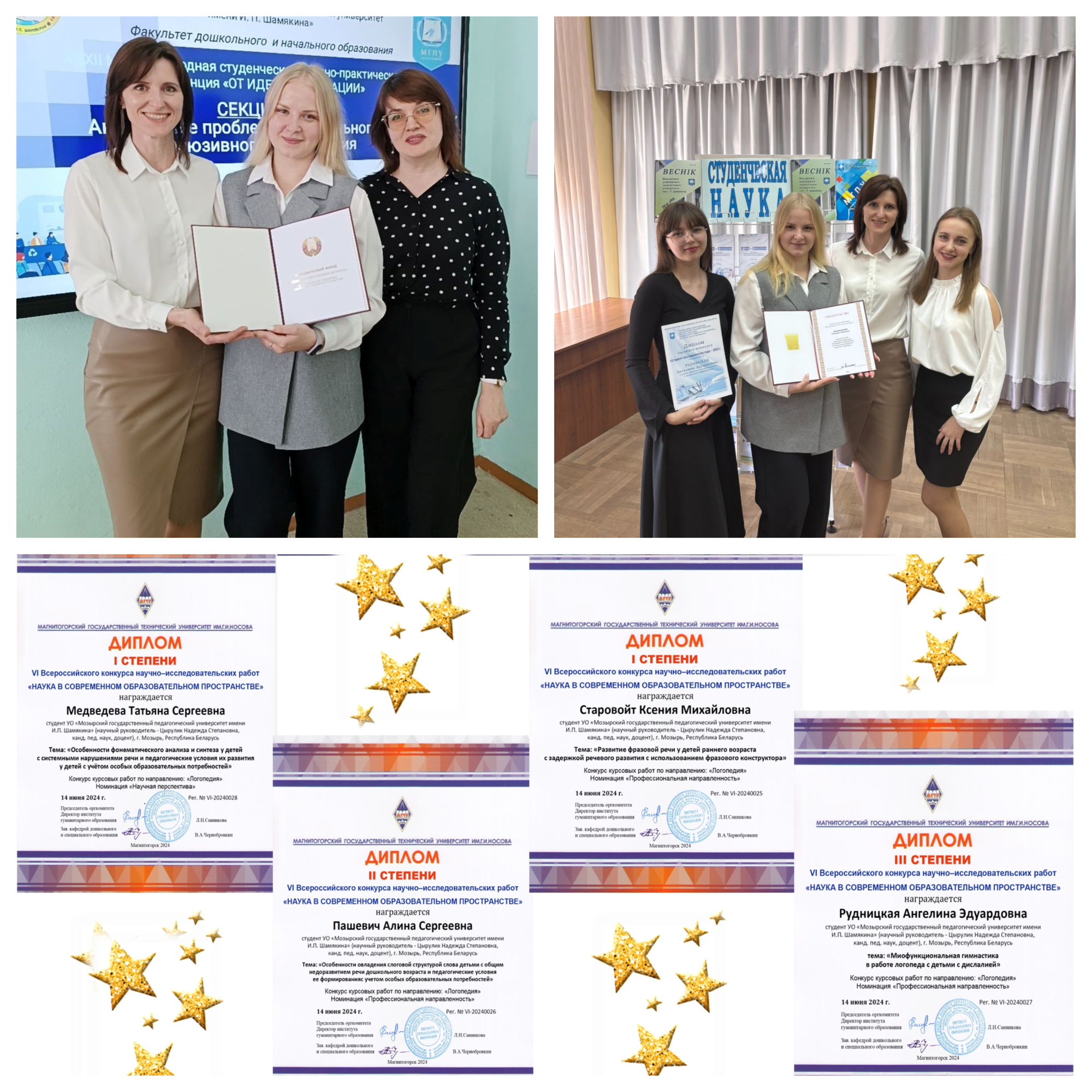 Поздравления получила Рудницкая Ангелина, студентка 3 курса специальности «Логопедия», с заслуженным Дипломом Лауреата конкурса «Студент-исследователь года», который в торжественной обстановке был вручен ей на пленарном заседании XXXII Международной студенческой научно-практической конференции «От идеи – к инновации».