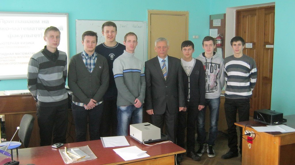 21 февраляв ауд. 424 кафедрой теоретической физики и прикладной математики был организован семинар для учащихся Антоновской средней школы Калинковичского района. Семинар проходил в соответствии с договором о сотрудничестве кафедры теоретической физики и прикладной математики с Антоновской средней школой. Заведующий кафедрой, доктор физико-математических наук, профессор Шепелевич В.В. представил учащимся и их учителю физики, выпускнику физико-математического факультета Кравчуку С.В. серию художественных голограмм. Особую актуальность голография приобретает в 2015 году, объявленном ООН и ЮНЕСКО Международным годом света. Учащиеся были ознакомлены с физикой формирования изумительного явления природы – радуги, а также с исследовательскими физическими задачами. Все школьники были приглашены к поступлению в наш университет.