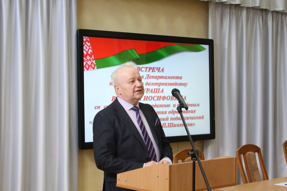 29 марта состоялась встреча директора Департамента по архивам и делопроизводству Министерства Юстиции Республики Беларусь Кураша Виктора Иосифовича, ректора университета Навныко Валерия Николаевича с трудовым коллективом и студенческой молодежью УО «Мозырский государственный педагогический университет им.И.П.Шамякина».