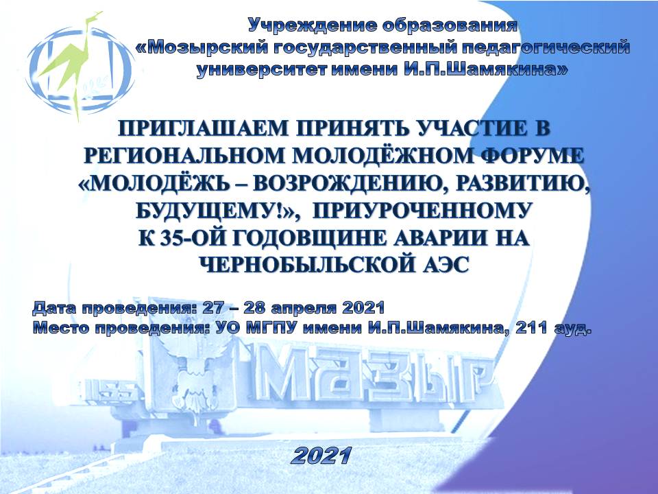 ПРИГЛАШАЕМ ПРИНЯТЬ УЧАСТИЕ В РЕГИОНАЛЬНОМ МОЛОДЁЖНОМ ФОРУМЕ «МОЛОДЁЖЬ - ВОЗРОЖДЕНИЮ, РАЗВИТИЮ, БУДУЩЕМУ!», ПРИУРОЧЕННОМУ К 35-ОЙ ГОДОВЩИНЕ АВАРИИ НА ЧЕРНОБЫЛЬСКОЙ АЭС Подробности Опубликовано 21.04.2021 08:48 Программа, положение Форума < Назад Вперёд >