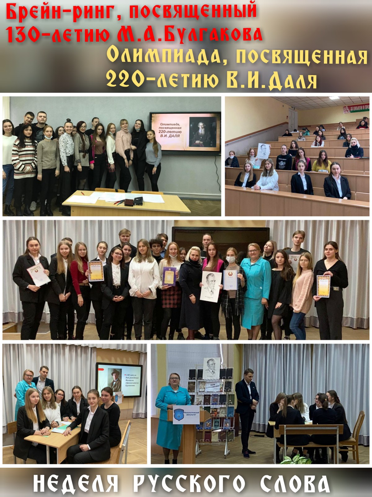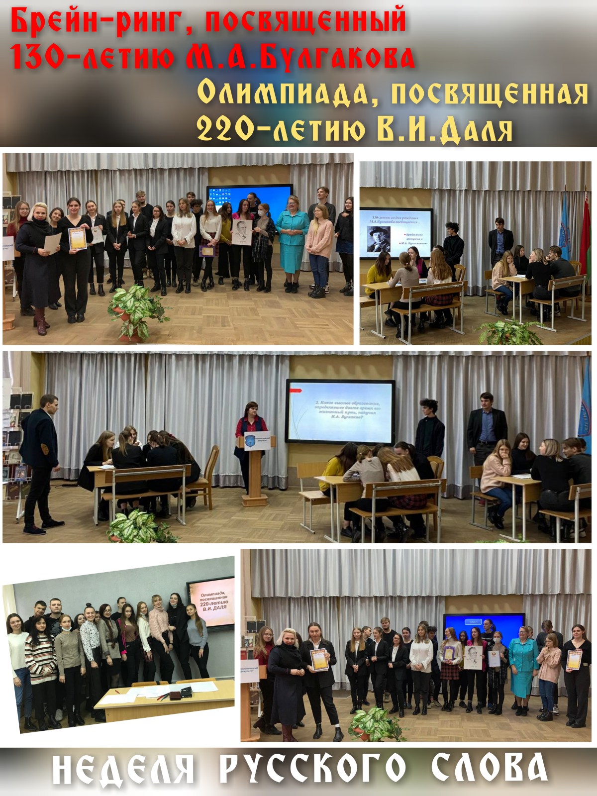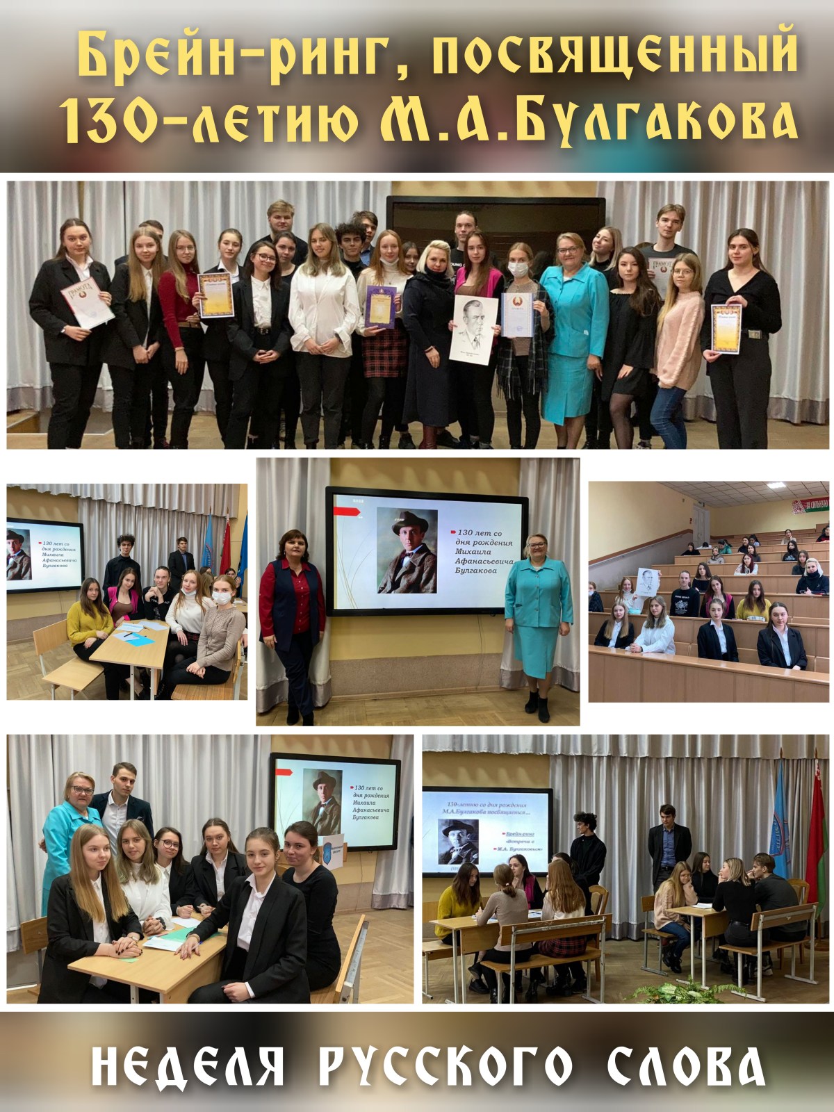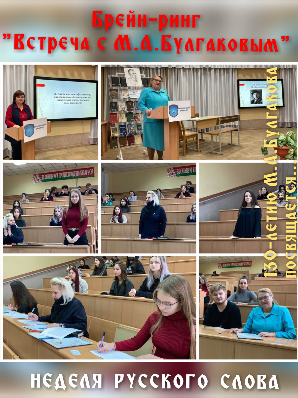 17 ноября в рамках Недели русского слова преподавателями кафедры белорусской и русской филологии (старшим преподавателем И.Л.Судибор и доцентом Е.В.Сузько) был проведен брейн-ринг «Встреча с М. А. Булгаковым», посвященный 130-летию со дня рождения выдающегося русского писателя, драматурга, театрального режиссера и актера. В начале мероприятия с торжественным «Словом о М.А. Булгакове» выступила ст. преподаватель И. Л. Судибор. Ирина Леонидовна охарактеризовала основные константы художественного мира писателя, подчеркнула значение его творчества для читателей ХХI века, для формирования у студенческой молодежи гражданской позиции и нравственно-духовных ценностей. Модератором проекта была доцент Е. В. Сузько.