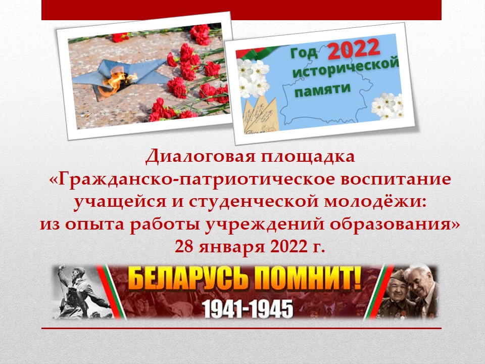 28 января 2022 г. доцент кафедры истории и обществоведческих дисциплин Гавриловец Л.В. приняла участие в работе диалоговой площадки на тему «Гражданско-патриотическое воспитание учащейся и студенческой молодёжи: из опыта работы учреждений образования». Диалоговая площадка состоялась на базе учреждения образования «Белорусский государственный педагогический университет имени М. Танка», модератором мероприятия выступила декан исторического факультета Скок В.П. Участие в диалоговой площадке приняли профессорско-преподавательский состав Белорусского государственного педагогического университета имени М. Танка, Мозырского государственного педагогического университета имени И.П. Шамякина, Гродненского государственного университета имени Я. Купалы (Беларусь), Башкирского государственного университета имени М. Акмуллы (Россия), администрация Светлогорского райисполкома, учителя истории учреждений общего среднего образования Светлогорского района.
