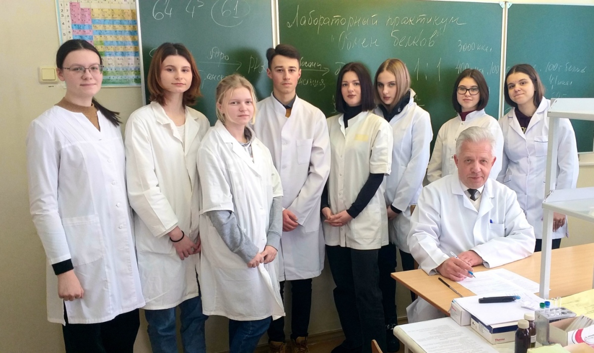 В работе приняли участие 9 учащихся ГУО «Средняя школа № 2 г. Ельска» и 19 учащихся ГУО «Средняя школа № 6 г. Мозыря» и ГУО «Средняя школа № 14 г. Мозыря». В ходе практикума были разобраны теоретические вопросы одной из основополагающих тем биохимии «Обмен белков». Выбор данной темы неслучаен, ведь именно белки выполняют строительную, защитную, регуляторную, транспортную, сократительную и другие жизненно важные функции организма. Школьники познакомились с классификацией белков, их строением, свойствами, значением, особенностями переваривания в желудочно-кишечном тракте, путями метаболизма аминокислот в тканях. Полученные теоретические знания учащиеся закрепили проведением лабораторной работы по определению содержания общего белка в сыворотке крови, что вызвало у школьников неподдельный интерес и желание дальше продолжать взаимодействие в формате «Школа - университет»
