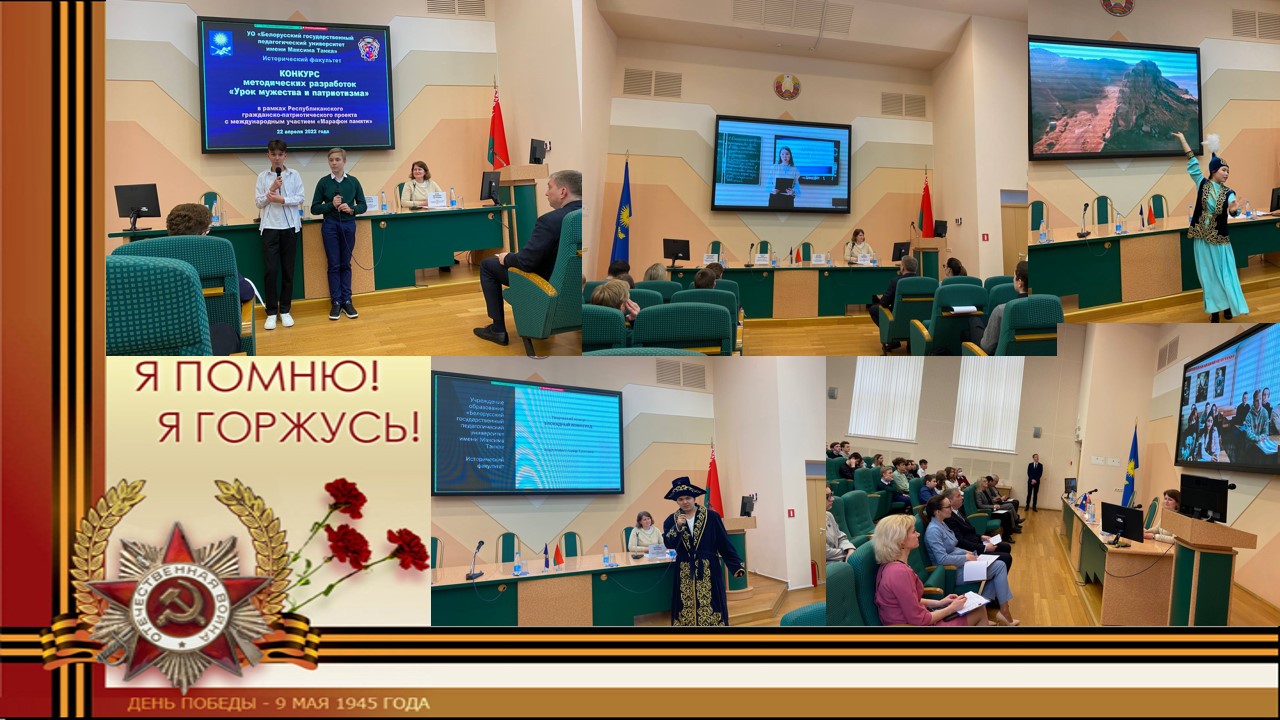 22 апреля 2022 года в рамках Республиканского гражданско-патриотического проекта с международным участием «Марафон памяти» состоялся конкурс методических разработок на тему «Урок мужества и патриотизма». Конкурс проходил на базе исторического факультета учреждения образования «Белорусский государственный педагогический университет имени Максима Танка» в два этапа. Первый этап – предоставление методических материалов урока мужества и патриотизма, второй – защита методических разработок в форме презентации или видеоурока. Филологический факультет учреждения образования «Мозырский государственный педагогический университет имени И.П. Шамякина» представляла студентка 3 курса специальности «История и обществоведческие дисциплины» Хомченко Виктория Вячеславовна.