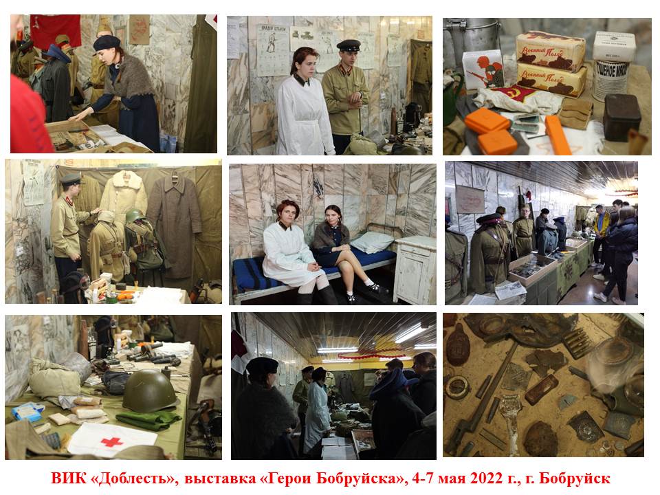 Члены ВИК «Доблесть» выступили в качестве экскурсоводов по экспозициям выставки. Участникам и гостям выставки было рассказано о довоенной жизни жителей Бобруйска, о подвиге курсантов Бобруйского военно-тракторного училища, об устройстве медицинской службы в годы Великой Отечественной войны, о судьбе жителей оккупированных территорий, о Белорусской наступательной операции «Багратион».