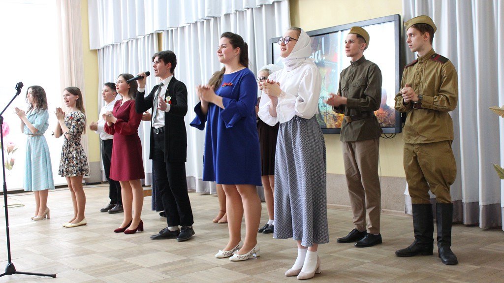 С самого утра в холле университета звучали песни военных лет, работала интерактивная площадка, организованная филологическим факультетом. Каждый желающий мог сфотографироваться на тематическом фоне и почувствовать причастность к этому грандиозному событию. С дорогим каждому сердцу праздником собравшихся поздравил ректор университета Валерий Николаевич Навныко. «9 Мая – для каждого из нас главный, особенный праздник. Наши деды и прадеды отстояли независимость Родины, открыли эпоху мирных свершений и побед. Мы должны сохранять и передавать из поколения в поколение память о всенародном подвиге, память о наших земляках, не вернувшихся с полей сражений», – подчеркнул Валерий Николаевич.