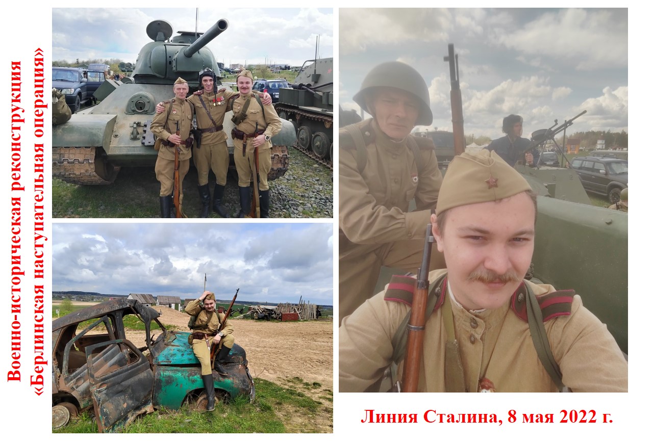8 мая 2022 г. студент 3 курса филологического факультета специальности «История и обществоведческие дисциплины», командир ВИК «Доблесть» Карасев Борис Сергеевич принял участие в военно-исторической реконструкции на «Линии Сталина». В этот день реконструкторы воссоздали один из боев Берлинской наступательной операции. Берлинская наступательная операция – заключительное сражение Великой Отечественной войны, которая фактически решила ее кровопролитный исход. Операция продолжалась 23 дня – с 16 апреля по 8 мая 1945 г. В Берлинской операции принимали участие войска 1-го Украинского, 1-го и 2-го Белорусских фронтов. Перед войсками была поставлена задача разгромить немецкие войска на Берлинском направлении, овладеть столицей Германии и с выходом на р. Эльба войти в соприкосновение с армиями союзников. 21 апреля 1945 г. передовые части 1-го Белорусского фронта ворвались в пригороды Берлина. 26 апреля начался штурм Берлина. К 30 апреля берлинский гарнизон противника был рассечен на изолированные группы, а управление войсками во всех звеньях – нарушено. К 8 мая советские войска вышли к Балтийскому морю и р. Эльба. Берлинская операция была завершена.