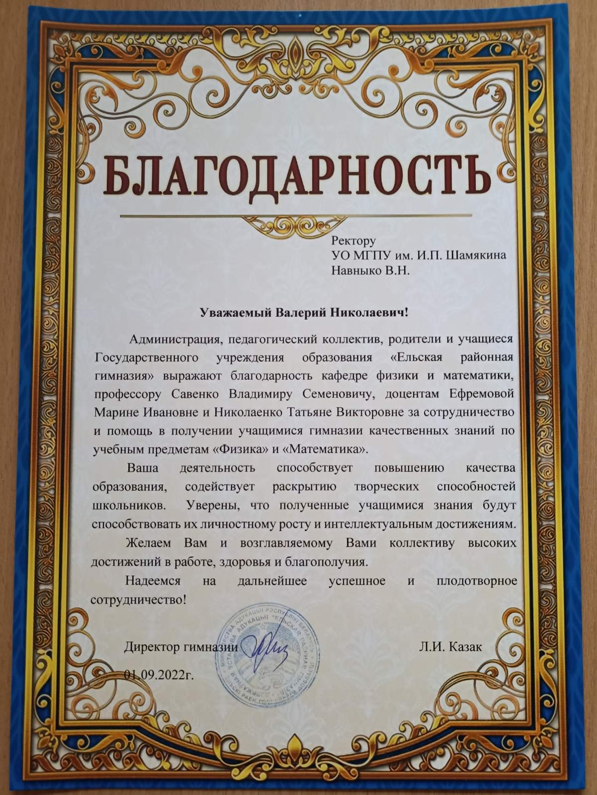 ГУО «Ельская районная гимназия» благодарит заведующего кафедрой физики и математики Савенко Владимира Семеновича, доктора технических наук, профессора, а также доцентов кафедры Ефремову Марину Ивановну и Николаенко Татьяну Викторовну за сотрудничество и помощь в получении учащимися гимназии качественных знаний и раскрытие творческих способностей школьников.