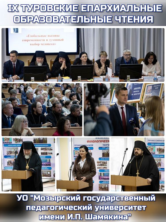 11 ноября 2022 года на филологическом факультете УО «Мозырский государственный педагогический университет им. И.П. Шамякина» состоялись IX Туровские епархиальные образовательные чтения «Глобальные вызовы современности и духовный выбор человека». Свои научные доклады, инновационные разработки по духовно-нравственному и гражданско-патриотическому воспитанию представили 253 участника чтений, среди которых – преподаватели и студенты высших учебных заведений Республики Беларусь и Российской Федерации (Сургутский государственный педагогический университет, Армавирский государственный педагогический университет), педагоги учреждений дошкольного, общего среднего и среднего специального образования из всех областей Республики Беларусь.
