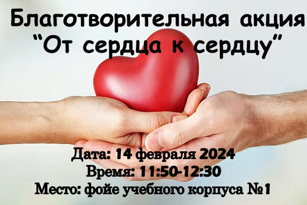 Приглашаем принять участие в благотворительной акции «От сердца к сердцу», которая состоится 14.02.2024 в 11:50-13:00 (место: фойе учебного корпуса №1).