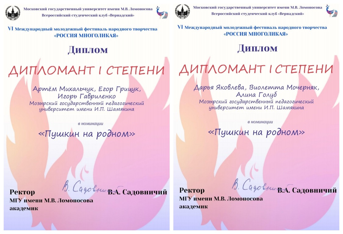 Под руководством куратора Л.В. Прохоренко, кандидата филологических наук, доцента, ребята подготовили видеоролики в номинации «Пушкин на родном». Авторитетным жюри фестиваля студенты нашего университета были награждены Дипломами I степени!