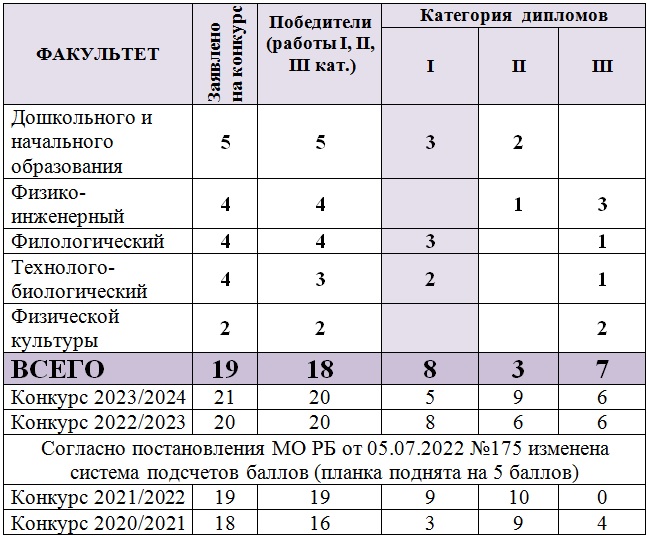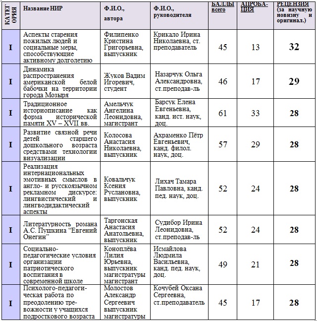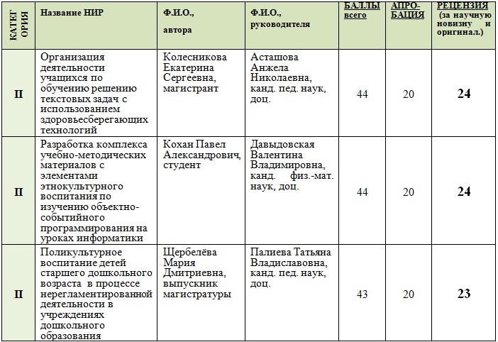 Все работы за научную составляющую набрали более 20 баллов и могли претендовать на 2 категорию при условии более широкой апробации результатов работ.