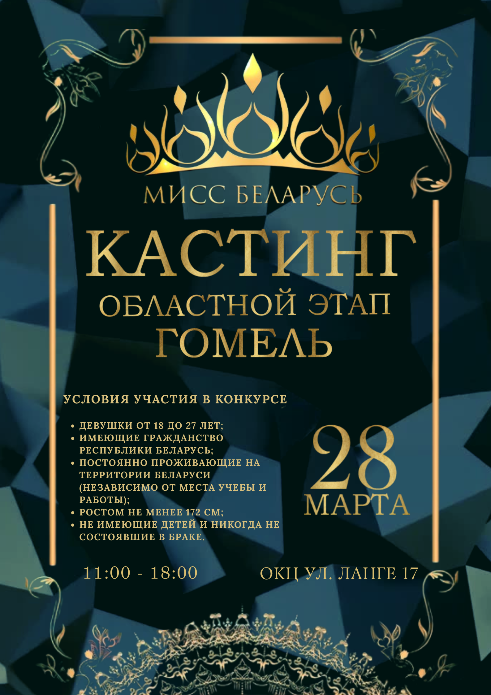 28 марта 2025 года с 11.00 до 18.00 в городе Гомеле в ГУ «Гомельский областной общественно-культурный центр» (ул. Ланге, 17) состоится областной этап кастинга XIV Национального конкурса красоты «Мисс Беларусь – 2025».