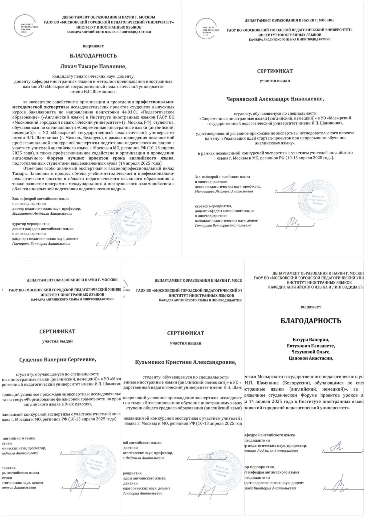 Студенты Кузьменко Кристина, Чернявская Александра, Сущенко Валерия успешно прошли независимую профессиональную конкурсную экспертизу с участием учителей английского языка г. Москвы и Московской области, а также регионов РФ, представив следующие исследовательские проекты: «Интегрированное обучение иностранному языку на второй ступени общего среднего образования (английский язык)», «Реализация идей стартап-проектов при непрерывном обучении английскому языку», «Формирование финансовой грамотности на уроках английского языка в 9 классах». Высокие оценки жюри по критериям «практичность», «жизнеспособность», «эвристика», «эргономика» получили проекты Чернявской Александры и Кузьменко Кристины.
