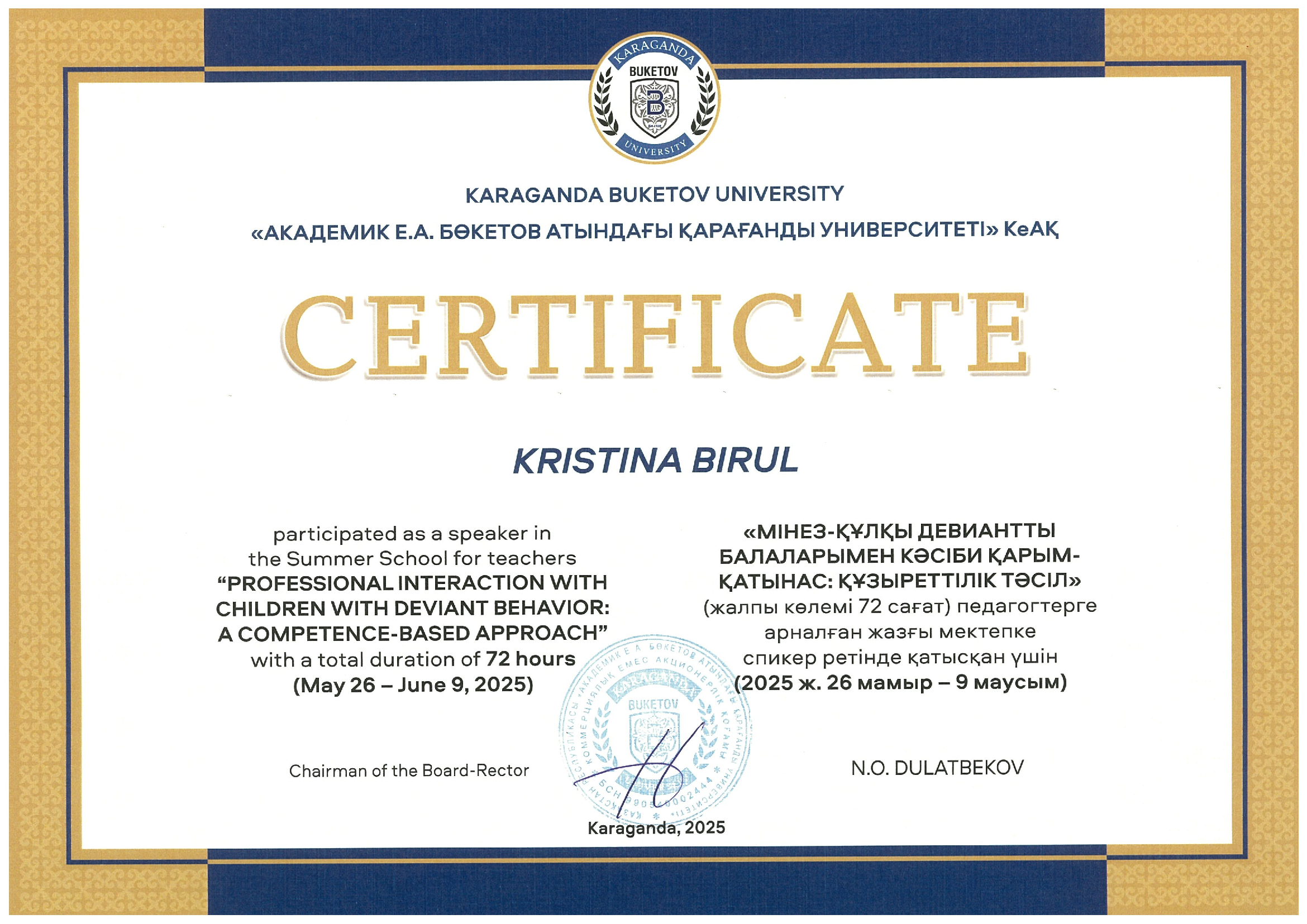 В рамках реализации международного сотрудничества Карагандинский университет имени академика Е.А. Букетова (Республика Казахстан) организовал Летнюю школу для педагогов по теме: «Профессиональное взаимодействие с детьми с девиантным поведением: компетентностный подход».