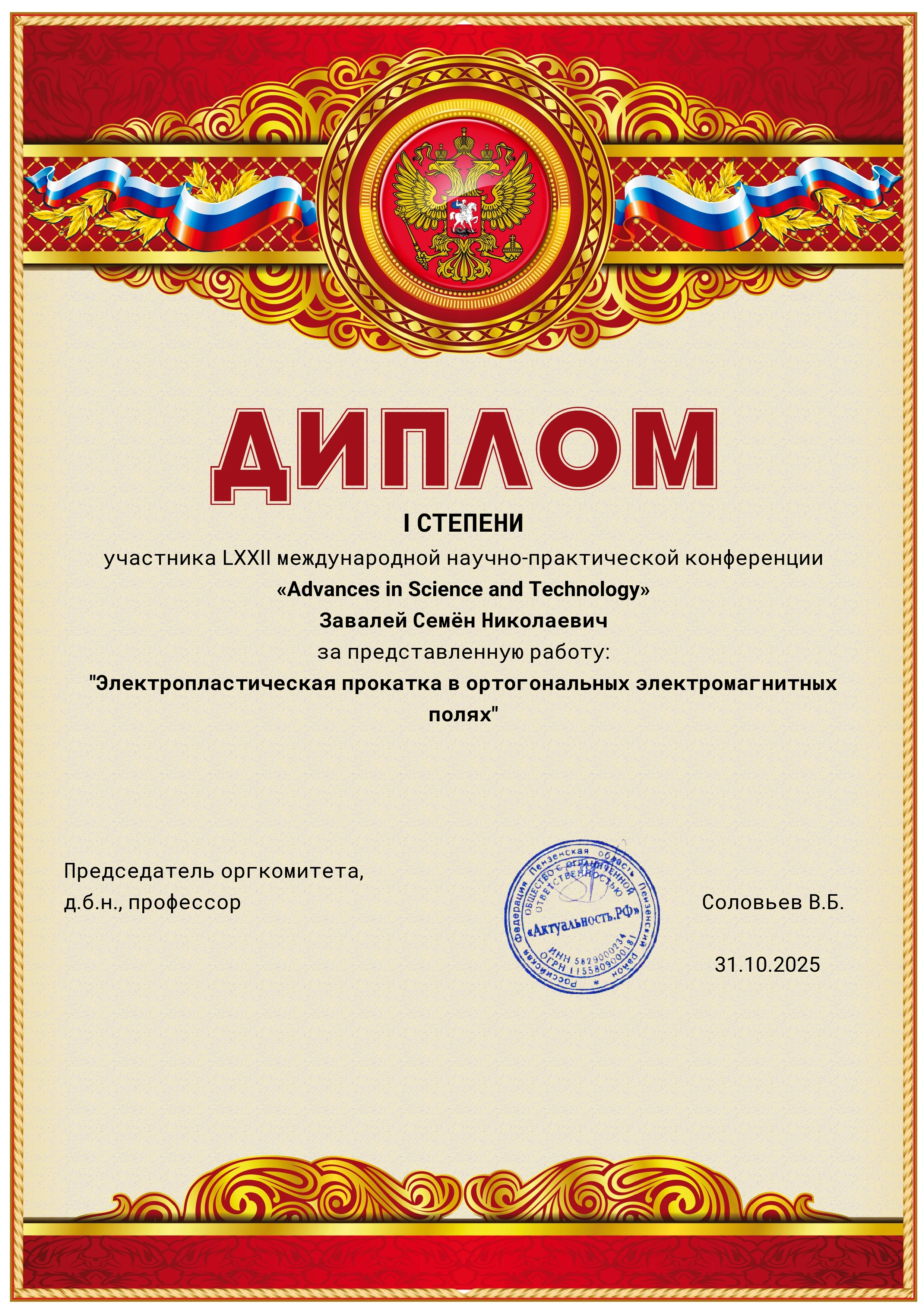 31 октября 2025 года в Москве прошла 72-я Международная мультидисциплинарная научно-практическая конференция «Advances in Science and Technology». Студент физико-инженерного факультета Семён Николаевич Завалей под научным руководством доктора технических наук, профессора Владимира Семёновича Савенко представил исследование на тему «Электропластическая прокатка в ортогональных электромагнитных полях», которое было включено в секцию 08 «Физико-математические науки». Работа получила диплом первой степени. Статья опубликована в сборнике Научно-издательского центра «Актуальность.РФ» с присвоением ISBN, УДК и ББК, а также размещена в электронной библиотеке elibrary.ru.