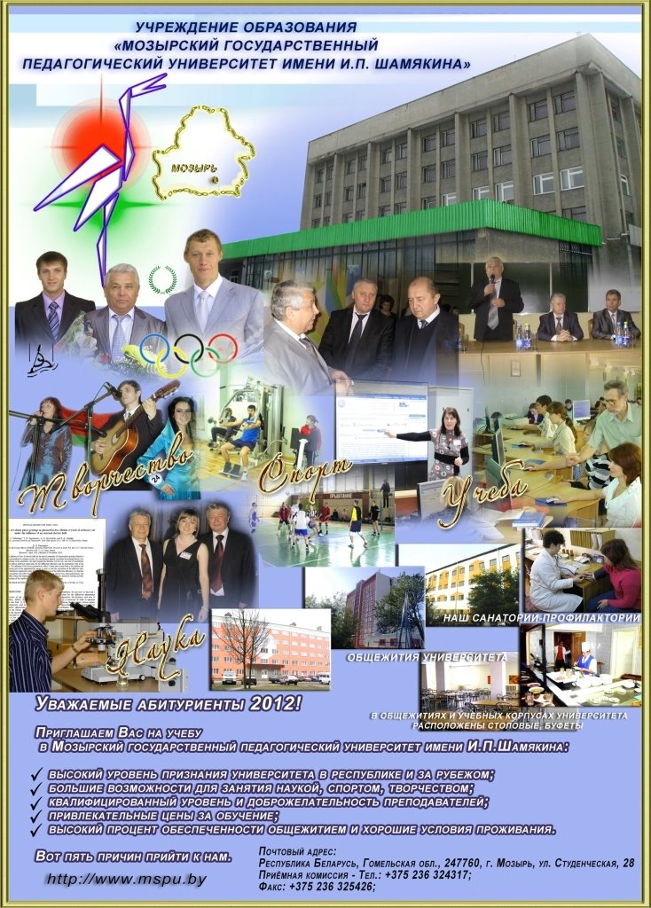 Первой была представлена презентация учреждения образования «Мозырский государственный педагогический университет имени И.П.Шамякина». Делегация университета в составе проректора по учебной работе Щура С.Н., декана факультета довузовской подготовки и профориентации Гречанникова Э.Е. и декана филологического факультета Исмайловой Л.В. представила учащимся выпускных классов Гомельской области полную информацию о факультетах, специальностях и условиях приема в университет. На заданные учащимися вопросы были даны исчерпывающие ответы.