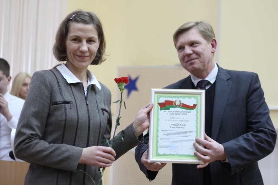 за высокие научные результаты, подготовку научных кадров, активную работу по внедрению инновационных технологий в процессе обучения студентов и в связи с празднованием Дня белорусской науки Почетной грамотой Мозырского районного Совета депутатов награждена Елена Юрьевна ГУМИНСКАЯ, заведующая кафедрой природопользования и охраны природы, кандидат сельскохозяйственных наук, доцент;