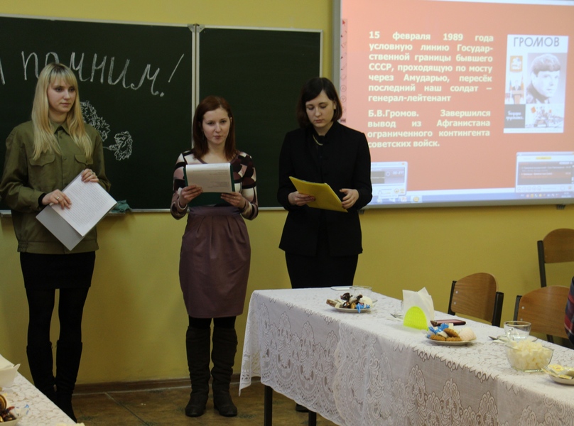 Ведущие мероприятия Архипова Вероника и Бочкова Елена ознакомили присутствующих с основными этапами и особенностями афганской войны. Музыкальное оформление мероприятия, показ слайдов из жизни солдат, песни в исполнении Елены Бочковой и Валерия Дековца, тематические стихи, прочитанные Грищенко Татьяной и Тушинской Дарьей, – все было продумано до мелочей. В сосредоточенных взглядах участников встречи читалось уважение, восхищение и гордость за советских солдат. Под звуки метронома и мерцание свечи все присутствующие почтили минутой молчания память погибших в той страшной войне.