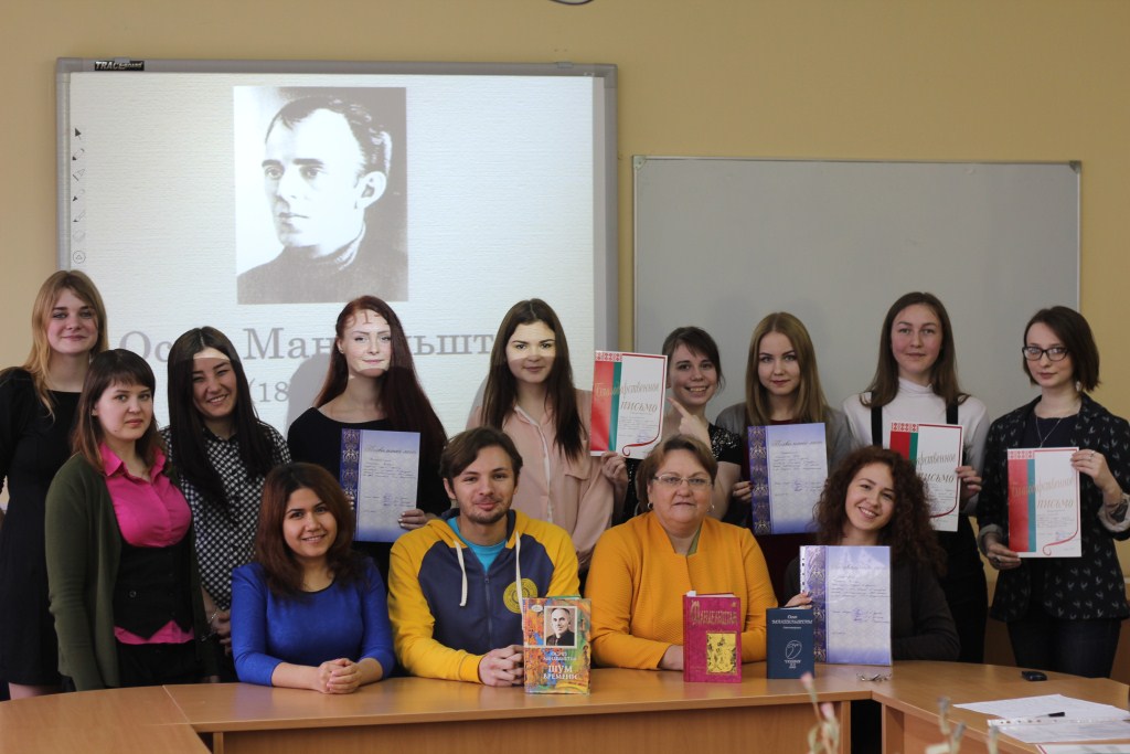 11. 03. 2016 на филологическом факультете в рамках работы Литературной гостиной состоялся конкурс чтецов, посвященный 125-летию со дня рождения яркого представителя эпохи Серебряного века Осипа Мандельштама. Мероприятие было подготовлено студентами 2 курса 1 группы специальности «Русский язык и литература». Венгура Алина, ведущая Литературной гостиной, отметила, что главными источниками литературного творчества поэта «были русский язык… да вечно бессонная мысль», поэтическое «Я» Осипа Мандельштама и сегодня включено в движение истории, культуры, мифологии.