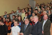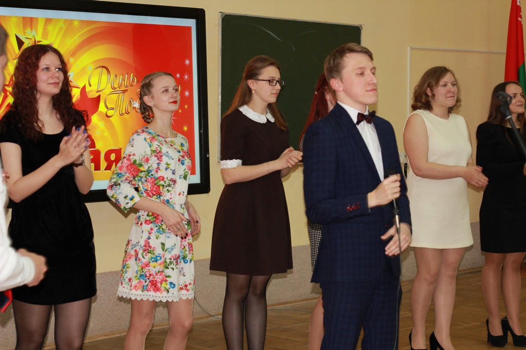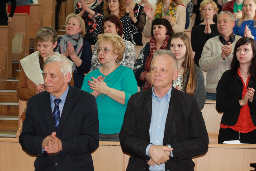 Поздравить коллектив на сцену был приглашен первый проректор университета Валерий Сергеевич Болбас. В своей поздравительной речи Валерий Сергеевич отметил, что День Победы дорог каждому из нас. Все, кто шел в те годы под пули, снаряды и бомбы, кто в тылу врага приближал этот день, готовы были терпеть любые лишения, отдать свои жизни, лишь бы процветала любимая Родина, был свободен и счастлив ее народ. Обращаясь к студенческой молодёжи, он подчеркнул, что государство делает ставку на молодёжь, доверяет молодёжи, а грамотная молодёжная политика является стратегией государства. Именно поэтому сохранить память о великом подвиге советского народа в борьбе с фашизмом доверено молодёжи. Молодому поколению нужно беречь и любить свою страну, достойным трудом украшать ее расцвет и могущество.