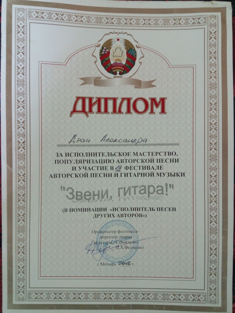 Результаты конкурса: Александра Драч награждена Дипломом в номинации «Исполнитель песен других авторов», а Ольга Жукевич – Грамотой участника.