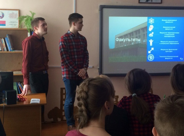 На презентации Лис Юрий и Шевчук Никита рассказали будущим абитуриентам о всех преимуществах учёбы в нашем университете. Гуцко Ирина Николаевна компетентно ответила на вопросы абитуриентов, развеяв мифы и доказав, что наш университет готовит очень хороших специалистов. А выпускница Козенской средней школы Тагаева Александра, нынешняя студентка первого курса филологического факультета и успешная староста 1 группы, рассказала ребятам о своих учебных достижениях, поделилась опытом руководства студенческой группой.