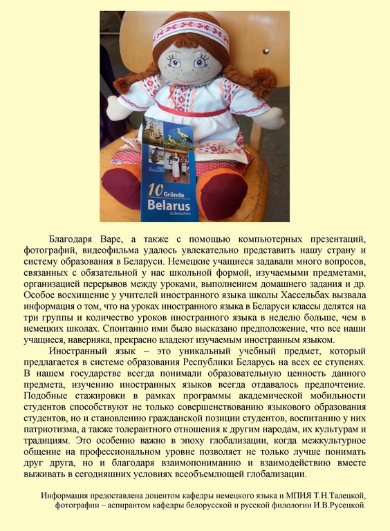 Международный образовательный проект «Академическая мобильность студентов» существует на кафедре немецкого языка и методики преподавания иностранных языков с 2004 года. Руководителем проекта является кандидат филологических наук, доцент Т.Н.Талецкая. За прошедшие годы стажировку в рамках этого проекта смогли пройти около 40 студентов и магистрантов. Главная цель проекта – совершенствование профессиональных компетенций будущих учителей немецкого языка – выпускников филологического факультета.