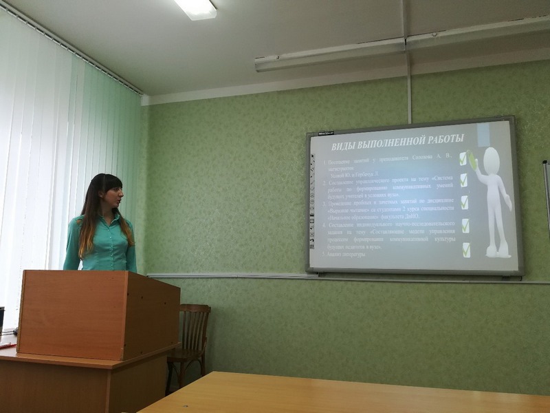 Больше всего мне понравилось проводить занятия со студентами, а именно взаимодействовать с ними, обсуждая вопросы, возникающие на протяжении занятий. Однако не могу сказать, что работать над остальными заданиями мне было тяжело. Нет! Я с удовольствием работала над ними, так как хотелось придумать что-то такое, что можно будет использовать в дальнейшем не только мне, но и другим. Например, предложенные мною приемы в научно-исследовательском задании можно использовать при проведении занятий по различным дисциплинам, так как они направлены на формирование коммуникативных умений студентов».