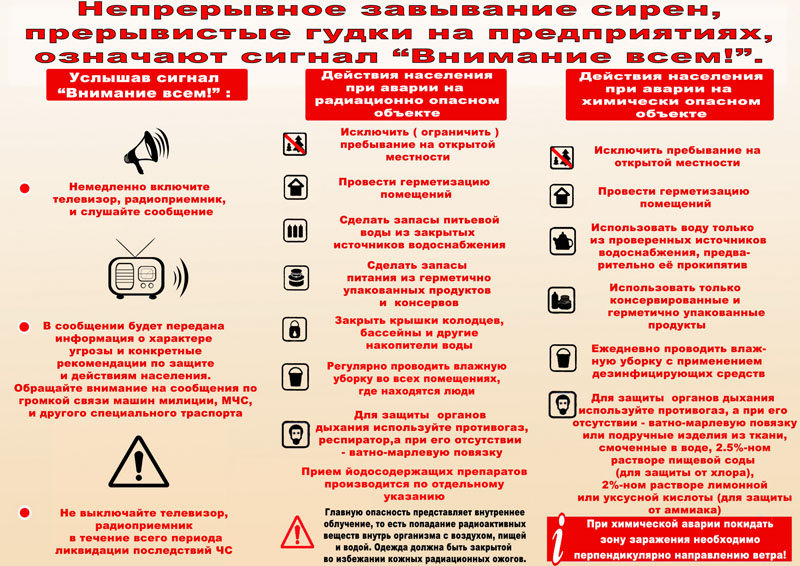 Одним из общепринятых сигналов гражданской обороны является сигнал «Внимание всем!», который подается в целях своевременного предупреждения об угрозе радиоактивного, химического, бактериологического загрязнения, угрозе и возникновения стихийных бедствий, крупных аварий или катастроф, а также принятия незамедлительных мер защиты.