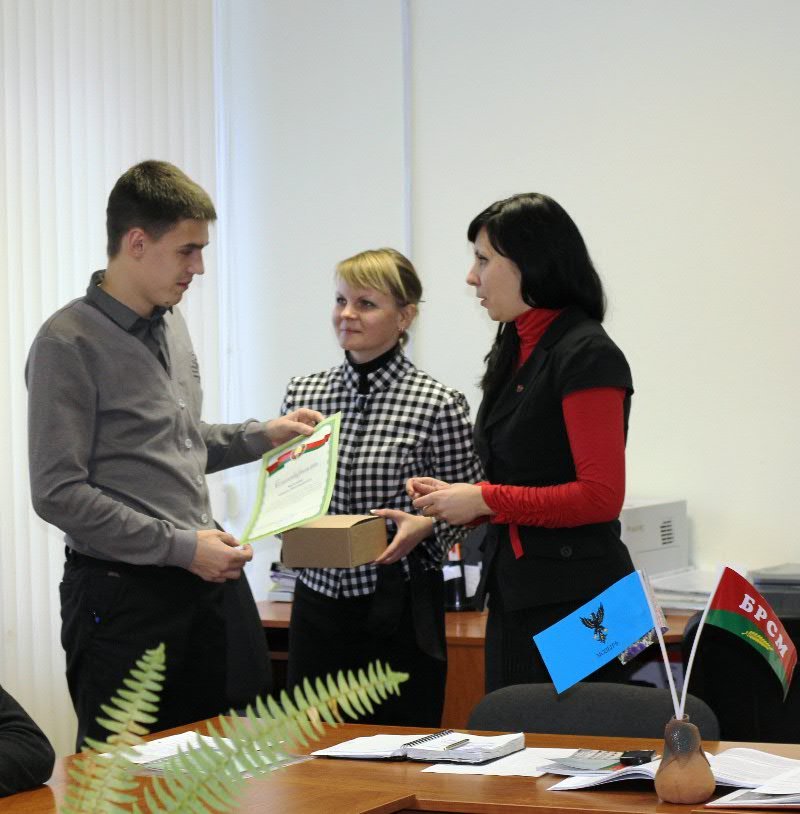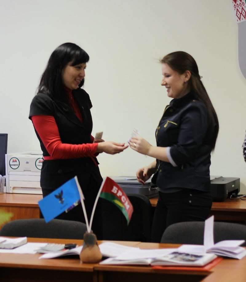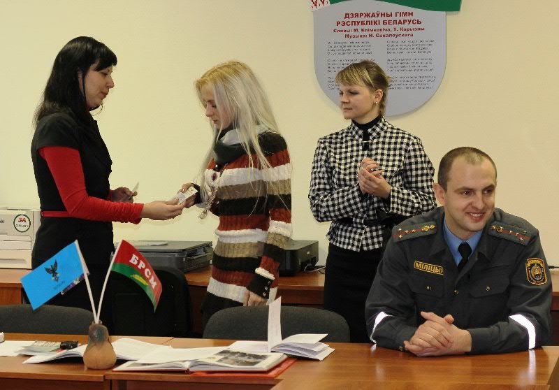 Численность молодежного отряда постоянно увеличивается. И в этот день первый секретарь Мозырского РК ОО «БРСМ» Козакевич А.П. и начальник отдела по воспитательной работе с молодежью Матвеева С.В. вручили удостоверения 12-ти дружинникам, которые решили попробовать себя в области охраны правопорядка. Также ребятам были вручены памятные сувениры и подарки от ОО «БРСМ». Командир отряда – Хильман Андрей (студент физико-математического факультета) отмечен благодарностью Мозыркого РК ОО «БРСМ» за качественное исполнение возложенных на него обязанностей.